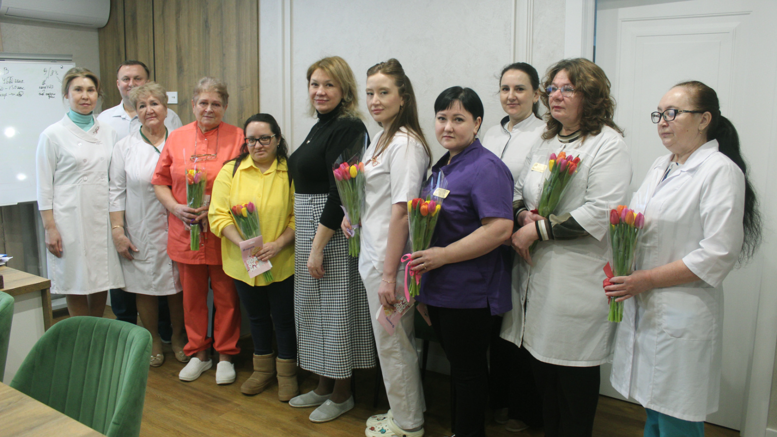 В преддверии Международного женского дня в нашем госпитале состоялось трогательное мероприятие. Главный врач Резеда Ришатовна Мавзютова и администрация учреждения поздравили сотрудниц, чьи мужья, сыновья и братья сегодня находятся в зоне проведения Специальной военной операции и защищают безопасность нашей Родины.